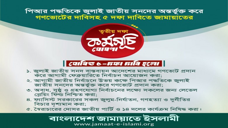 পিআর পদ্ধতিকে জুলাই জাতীয় সনদের অন্তর্ভূক্ত করে গণভোটের দাবিসহ ৫-দফা দাবিতে জামায়াত তৃতীয় দফা কর্মসূচি ঘোষণা করেছে।